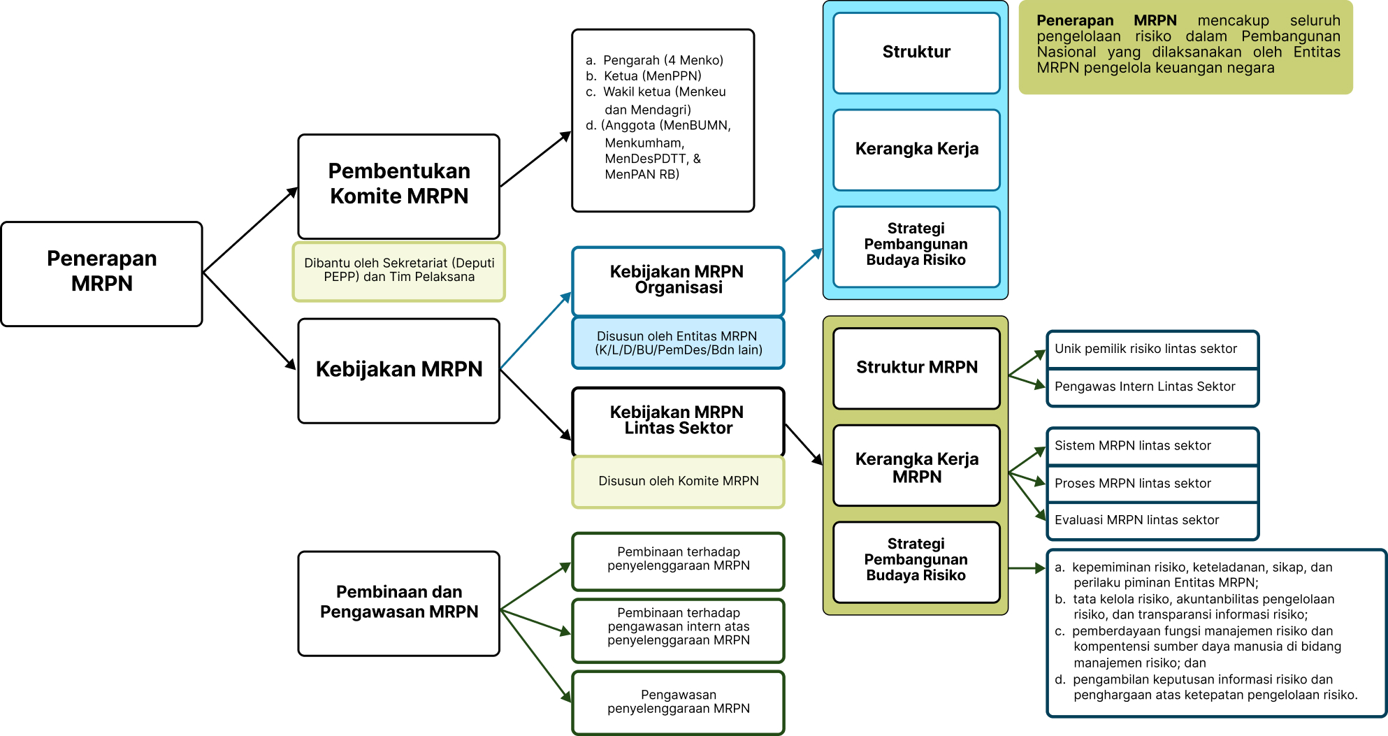 Manajemen Risiko Pembangunan Nasional merupakan kegiatan terkoordinasi untuk mengarahkan dan mengendalikan entitas MRPN sehubungan dengan adanya Risiko Pembangunan Nasional. Penerapan MRPN dilakukan berdasarkan Perpres 39/2024.